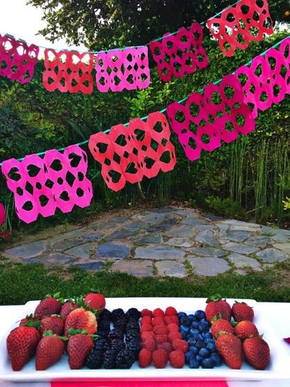 I kid you not, with the scent going around the house I couldn’t help but make something bright, playful,vivid, full of color and culture. So I thought for a minute and decided to make some papel picado banners to decorate our “berry” yummy backyard fruit bar. The idea was to smell the fragrance of Glade® Radiant Berries™ Candles inside the house and enjoy the fresh fruit outside with a vivid rush of bright and bold Mexican decorations!